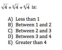 However, taking a more logical and high-level approach to this question, we can see that the answers are given as ranges, not specific values. One must consider then, why would we try to factor out and solve a pretty nasty looking equation when the test-maker is not even giving us specific values as answers? Could it be that we are just meant to estimate here? Well if we start to head down that path we will see that we can very quickly make some positive progress. The first term (the square root of 4) is equal to 2, so we already know that the answer is C, D, or E. Now all we have to do is estimate what the second and third term equal. Well the cubed root of 4 is the number that when cubed equals 4. This is not going to be an integer, but if we try to estimate here we are going to find that the number has to be between 1 and 2. 1 cubed is 1 and 2 cubed is 8 so the number that when cubed equals 4 must be between 1 and 2. At this point the answer must be D or E. Well the same logic that applied to the cubed root of 4 would apply to the 4th root of 4. 1 to the 4th power is only 1, so the 4th root of 4 must be bigger than 1 and so the answer must be E.